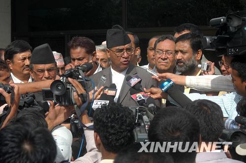 8月14日,來自尼泊爾制憲會議第二大黨的尼泊爾前首相德烏帕(中)在首都加德滿都辦理候選資格手續(xù)后接受記者采訪。尼泊爾共和國將于15日進(jìn)行首任總理選舉,德烏帕和尼泊爾共產(chǎn)黨(毛主義)主席普拉昌達(dá)于當(dāng)天獲各自政黨提名,進(jìn)行參選。 | |