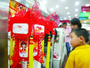 在北京奧運會特許商品旗艦店里,福娃可多了,有瓷質(zhì)的,有玉的,還有PU革、絲綢的……小小的福娃鑰匙扣、福娃中國結、紅色的福娃宮燈、福娃風箏、金屬的福娃小火車(每個吉祥物一列車廂)……讓人眼花繚亂,價格非常多樣化,檔次齊全,便宜的像福娃屏幕擦,2塊錢一個,鑰匙扣,20多塊錢,呵呵,最貴的可要算紅木架子上的5個玉福娃了,標價29萬元,相當于近6萬元一個。