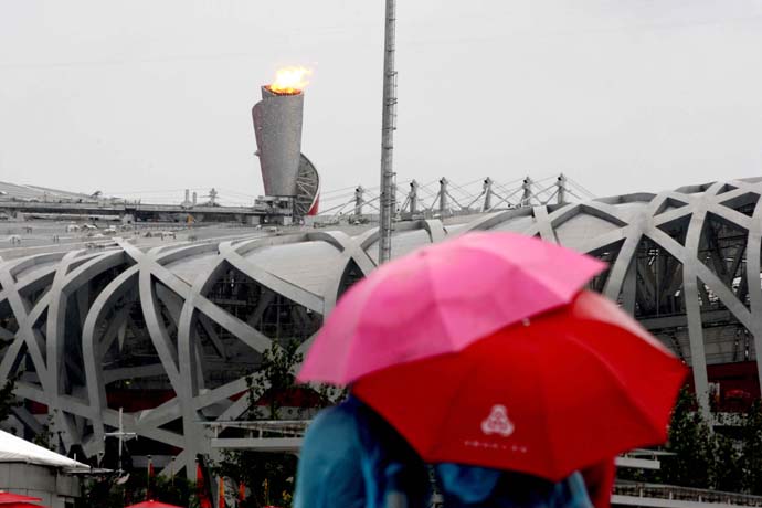 8月14日,游人在雨中觀看奧運(yùn)會主火炬。