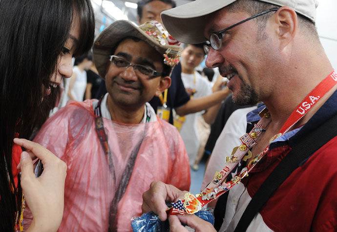 8月14日,在北京地鐵里,“章迷”們在互換奧運(yùn)紀(jì)念章。奧運(yùn)會,也是來自世界各地的奧運(yùn)紀(jì)念章迷們的盛會。大家在北京互換紀(jì)念章,“以章會友”,共同享受奧運(yùn)帶來的快樂。