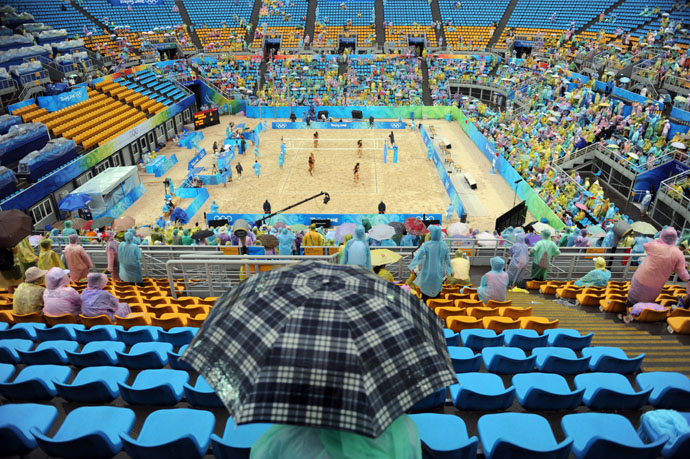8月14日,觀眾在朝陽公園沙灘排球場冒雨觀看比賽。當(dāng)日,北京奧運(yùn)會(huì)沙灘排球小組賽在這里舉行,盡管北京降雨,卻依然擋不住沙排球迷的熱情。