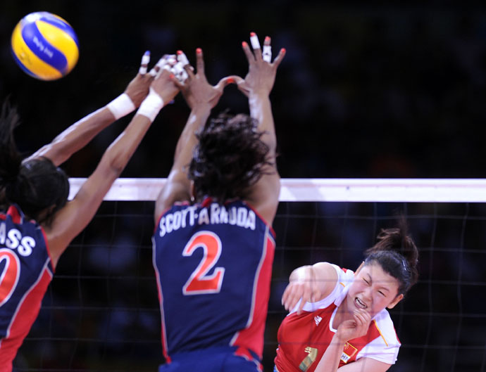 8月15日,在北京奧運會女子排球預(yù)賽A組(第23場)的比賽中,中國隊2比3惜敗美國隊。