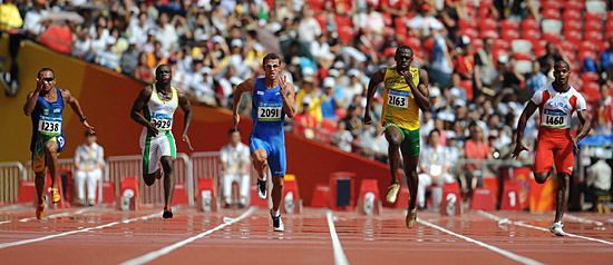 博爾特、蓋伊、鮑威爾,他們是當(dāng)今男子百米的頂尖高手;劉翔、羅伯斯,他們是目前男子110米欄的佼佼者。此外,他們還有個(gè)共同的稱號(hào)——“飛人”。 8月15日,北京奧運(yùn)會(huì)田徑項(xiàng)目的比賽終于拉開帷幕。 “飛人”聚集鳥巢,開始他們飛翔的精彩對(duì)決。 速度,是對(duì)奧林匹克格言“更快、更高、更強(qiáng)”最直白的詮釋;速度,是人類原始而恒久的追求。 那么,人類競(jìng)速的極限何在?