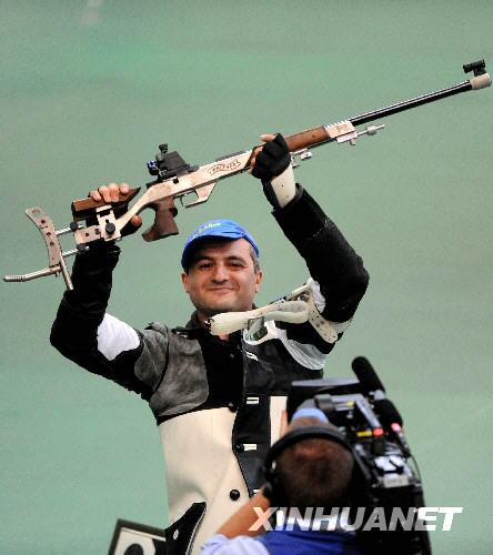 8月15日,烏克蘭選手阿爾圖爾·艾瓦江賽后慶祝勝利。當(dāng)日,在北京奧運(yùn)會(huì)射擊男子50米步槍臥射比賽中,烏克蘭選手阿爾圖爾·艾瓦江以702.7環(huán)的成績(jī)獲得冠軍。