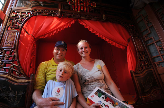 8月15日,澳大利亞游客在什剎海南官房胡同39號“奧運(yùn)人家”的中式婚床上合影。8月8日北京奧運(yùn)會開幕后,北京市的“奧運(yùn)人家”成為中外游客的關(guān)注焦點(diǎn)。位于什剎海附近的“奧運(yùn)人家”游客絡(luò)繹不絕,游客在這里能夠深切感受到老北京所特有的皇城文化與傳統(tǒng)特色。