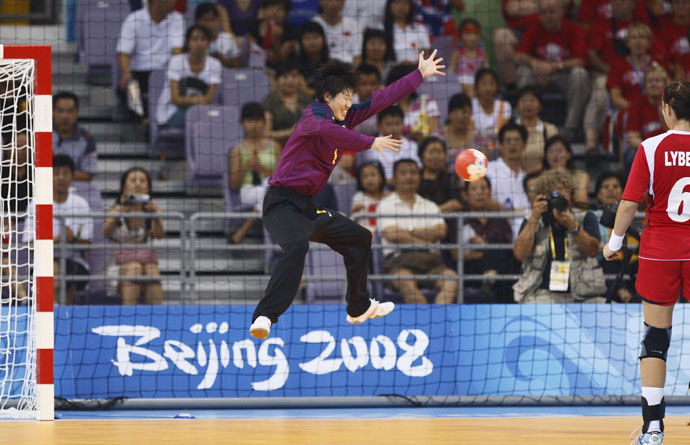8月9日,中國隊守門員劉桂妮在比賽中撲救。當日,在北京奧運會女子手球預賽A組比賽中,中國隊以23比30負于挪威隊。