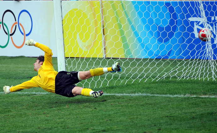 8月10日,新西蘭國(guó)奧隊(duì)門將斯普利在撲救巴西隊(duì)球員羅納爾迪尼奧的點(diǎn)球中失利。當(dāng)日,在沈陽(yáng)奧體中心舉行的奧運(yùn)會(huì)男子小組賽C組比賽中,巴西國(guó)奧隊(duì)以5比0戰(zhàn)勝新西蘭國(guó)奧隊(duì)。