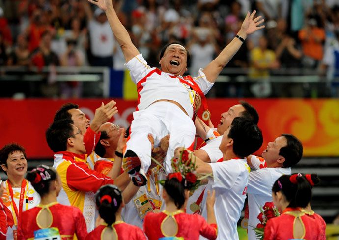 8月13日,中國(guó)隊(duì)在國(guó)家體育館創(chuàng)造歷史。中國(guó)隊(duì)在北京奧運(yùn)會(huì)體操女子團(tuán)體決賽中以188.900分的成績(jī)奪得冠軍。這是賽后隊(duì)員為主教練陸善真(上)戴上金牌,然后將他拋起慶祝勝利。