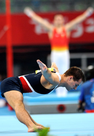 8月9日,美國選手喬伊·哈格蒂在北京奧運會體操男子自由操資格賽第一場比賽中取得15.275分的成績。這是他在賽前仍然一絲不茍地練習(xí)動作。
