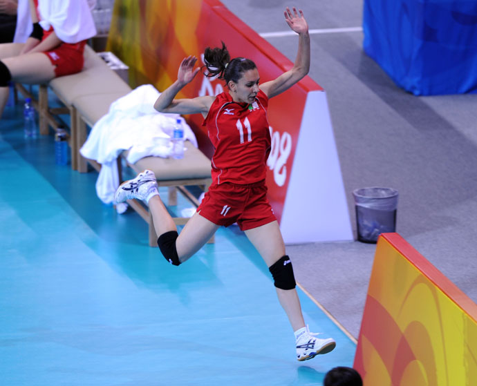 8月9日,在北京奧運會女排小組賽中,阿爾及利亞隊球員阿卜杜勒·拉希姆沖出場地救球。