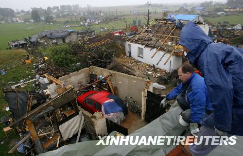 8月16日,在波蘭南部的斯切爾采奧波爾斯基附近,人們正在維修被龍卷風損毀的房屋。據波蘭有關部門說,一場龍卷風15日襲擊了波蘭一些地區(qū),造成3人死亡,另有數人受傷。 新華社/路透