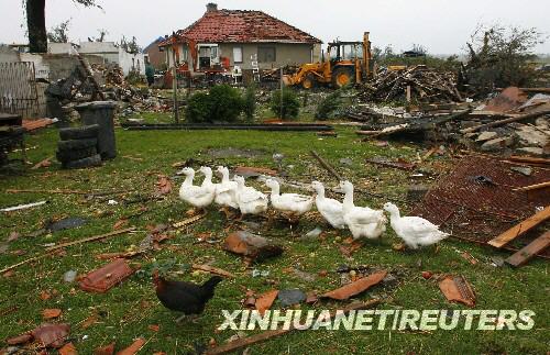 8月16日,在波蘭南部的切爾采奧波爾斯基附近,一群鵝在一片狼藉的庭院內(nèi)覓食。據(jù)波蘭有關(guān)部門說,一場龍卷風(fēng)15日襲擊了波蘭一些地區(qū),造成3人死亡,另有數(shù)人受傷。 新華社/路透