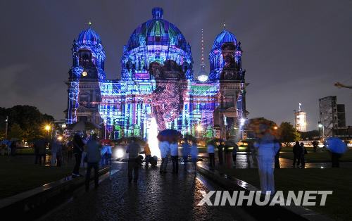 8月15日,行人在被彩燈裝飾的德國柏林大教堂外駐足。在燈光藝術(shù)節(jié)上,歐洲藝術(shù)家們用彩燈裝飾教堂,吸引了許多觀眾。新華社/法新