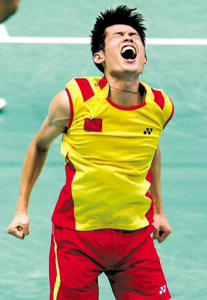 中國(guó)選手林丹在慶祝勝利。 新華社記者 張晨