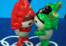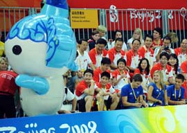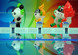 8月17日,福娃為選手助威。當(dāng)日,北京奧運(yùn)會(huì)女子3米跳板決賽在國家游泳中心——“水立方”舉行。
