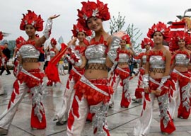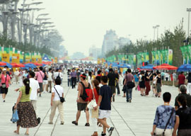 8月17日,演員在奧林匹克公園的景觀大道行進(jìn)表演。當(dāng)日,4萬(wàn)觀眾來(lái)到北京奧林匹克公園游覽。占地1000多公頃的北京奧林匹克公園包括奧林匹克森林公園、景觀大道、國(guó)家體育館、國(guó)家體育場(chǎng)、國(guó)家游泳中心和運(yùn)動(dòng)員村等設(shè)施。