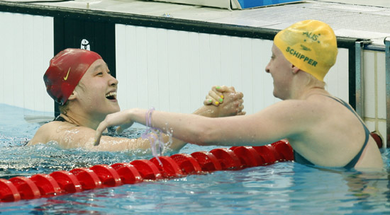 8月14日,中國(guó)選手劉子歌(左)接受澳大利亞選手斯基佩爾的祝賀。當(dāng)日,劉子歌在女子200米蝶泳決賽中以2分04秒18的成績(jī)創(chuàng)造新的世界紀(jì)錄并奪得冠軍。新華社記者:費(fèi)茂華