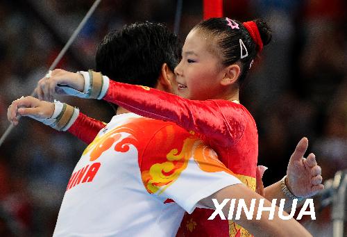 8月18日,中國選手何可欣在完成比賽后與教練擁抱慶祝。當(dāng)日,在國家體育館進(jìn)行的北京奧運(yùn)會(huì)體操高低杠決賽中,何可欣以16.725分的成績奪得冠軍。 新華社記者
