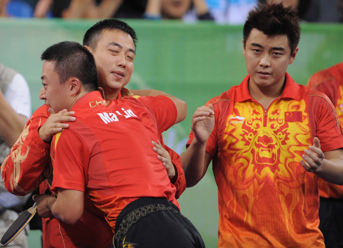 8月18日,中國(guó)選手馬琳(左一)獲勝后和主教練劉國(guó)梁擁抱。當(dāng)日,中國(guó)隊(duì)在北京奧運(yùn)會(huì)乒乓球男子團(tuán)體決賽中以3比0戰(zhàn)勝德國(guó)隊(duì),摘得金牌。