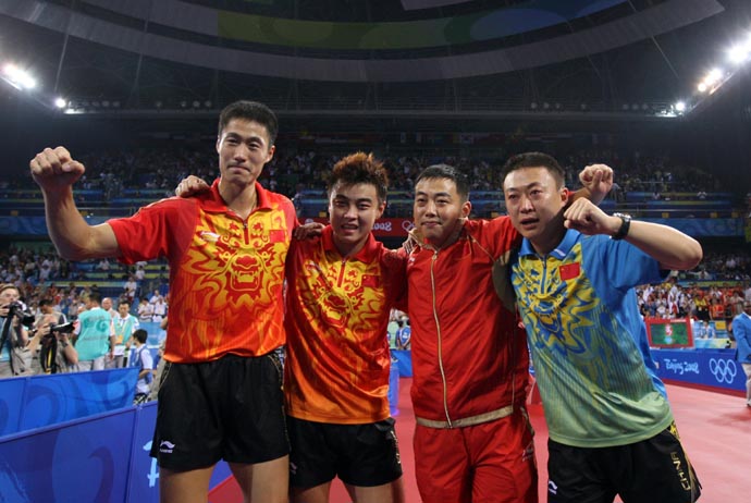 8月18日,中國(guó)男隊(duì)主教練劉國(guó)梁(右二)、隊(duì)員馬琳(右一)、王皓(左二)、王勵(lì)勤賽后合影。當(dāng)日,中國(guó)隊(duì)在北京奧運(yùn)會(huì)乒乓球男子團(tuán)體決賽中以3比0戰(zhàn)勝德國(guó)隊(duì),摘得金牌。