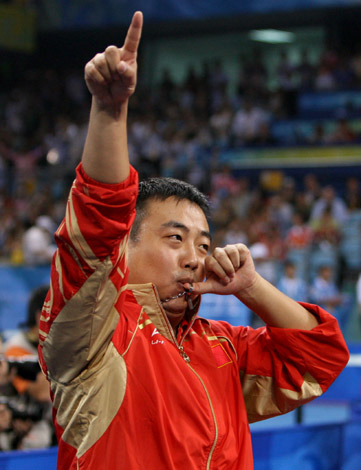 8月18日,中國(guó)男隊(duì)主教練劉國(guó)梁賽后親吻項(xiàng)鏈。當(dāng)日,中國(guó)隊(duì)在北京奧運(yùn)會(huì)乒乓球男子團(tuán)體決賽中以3比0戰(zhàn)勝德國(guó)隊(duì),摘得金牌。