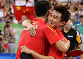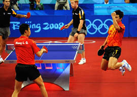 8月18日,中國隊(duì)在北京奧運(yùn)會(huì)乒乓球男子團(tuán)體決賽中以3比0戰(zhàn)勝德國隊(duì),摘得金牌。