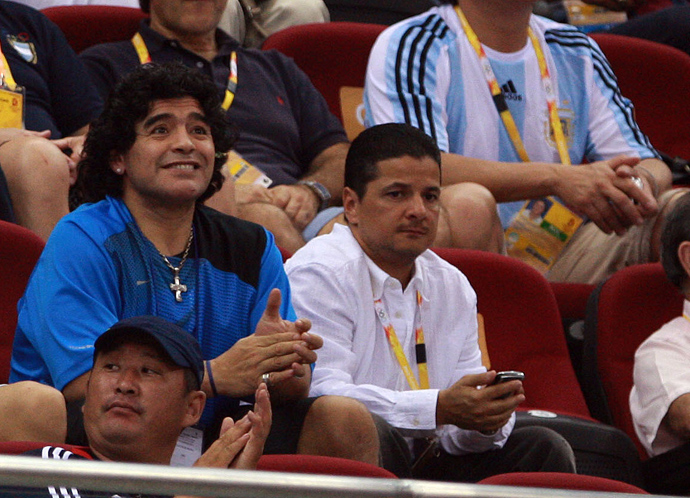 8月18日,阿根廷著名足球明星馬拉多納(左三)前來(lái)觀看阿根廷對(duì)俄羅斯的比賽。