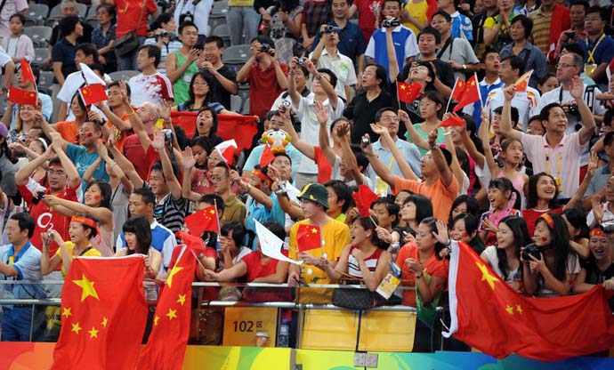 8月18日,觀眾在看臺(tái)上揮舞五星紅旗,為選手加油助威。當(dāng)日,北京奧運(yùn)會(huì)體操單項(xiàng)決賽和女子蹦床決賽在國(guó)家體育館進(jìn)行。
