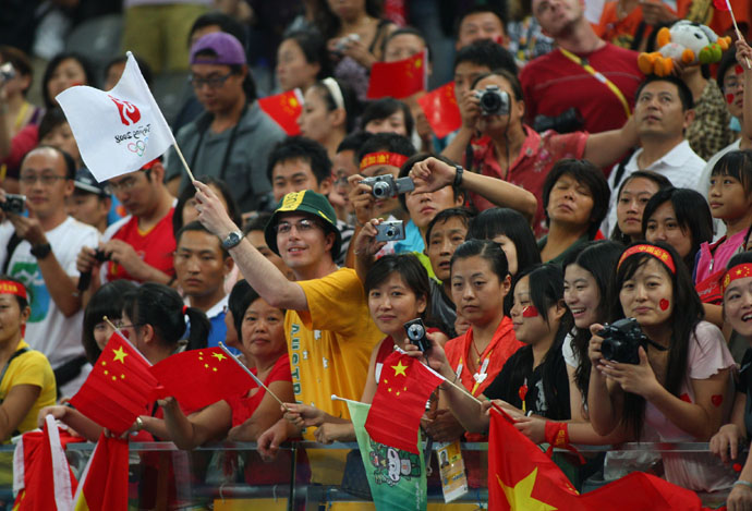 8月18日,觀眾在看臺(tái)上為選手加油助威。當(dāng)日,北京奧運(yùn)會(huì)體操單項(xiàng)決賽和女子蹦床決賽在國家體育館進(jìn)行。