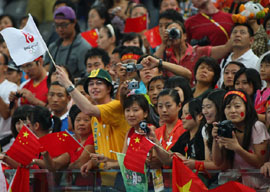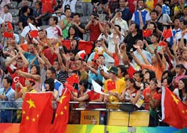 8月18日,觀眾在看臺上為選手加油助威。當日,北京奧運會體操單項決賽和女子蹦床決賽在國家體育館進行。