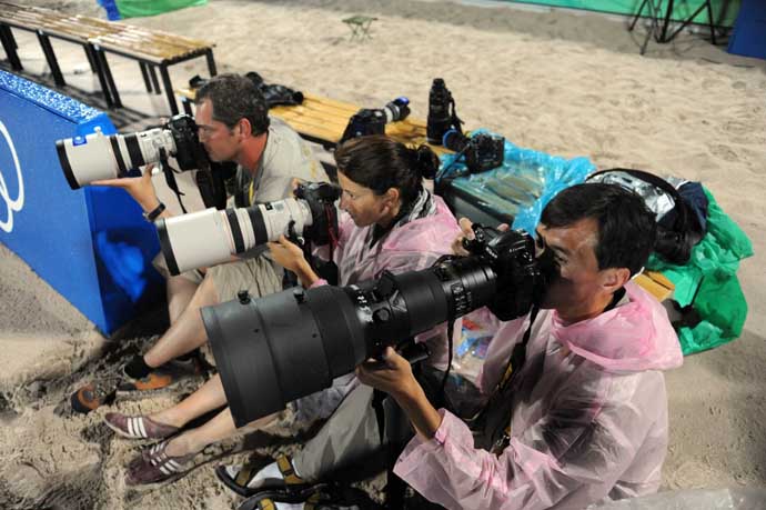 8月18日,新華社哈薩克族攝影記者沙達(dá)提在北京沙灘排球場(chǎng)內(nèi)與美聯(lián)社、法新社等多家媒體一起忙碌地處理圖片。