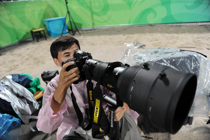8月18日,新華社哈薩克族攝影記者沙達(dá)提在北京沙灘排球場(chǎng)內(nèi)與美聯(lián)社、法新社等多家媒體一起忙碌地處理圖片。