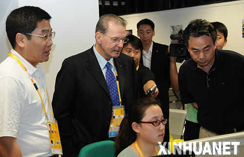 國際奧委會主席羅格(中)14日上午參觀位于北京奧運(yùn)會主新聞中心的新華社奧運(yùn)前方報(bào)道團(tuán),圖為新華社副總編輯彭樹杰(右)向羅格介紹新華社奧運(yùn)報(bào)道情況。新華網(wǎng)記者 胡孝乾