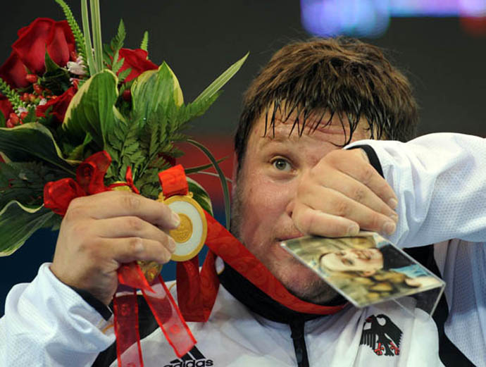 8月19日,德國選手馬蒂亞斯·施泰納在舉重男子105公斤以上級決賽中以461公斤的總成績摘得金牌。圖為馬蒂亞斯·施泰納在領(lǐng)獎臺上手持金牌、鮮花和妻子的照片喜極而泣。