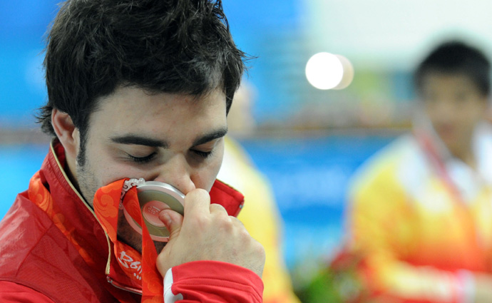 8月19日,加拿大選手德斯帕蒂親吻獎牌。當日,北京奧運會跳水比賽在國家游泳中心——“水立方”繼續(xù)進行,德斯帕蒂在男子3米跳板決賽中以536.65分的成績獲得亞軍。