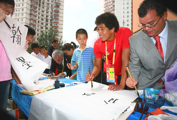 8月19日,智利運動員埃利奧特(右二)在學寫毛筆字。當日,幾位參加北京奧運會的智利客人來到“同心結”學!髁_園五小參觀,向孩子們學習剪紙、捏面人和書法等中國傳統(tǒng)藝術。