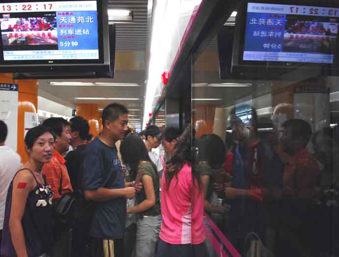 8月19日,在北京地鐵5號(hào)線東單站,幾名乘客準(zhǔn)備乘地鐵前往奧運(yùn)場(chǎng)館觀看比賽。