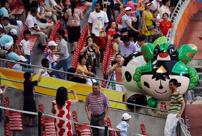8月19日,熱情的觀眾紛紛與福娃合影留念。北京奧運會田徑比賽在國家體育場漸入高潮,前來“鳥巢”觀賽的觀眾們更是熱情高漲。
