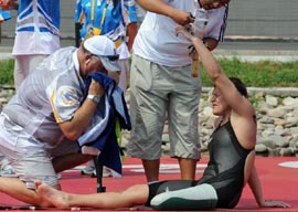 不像室內(nèi)游泳比賽每個選手都有專門水道,馬拉松游泳選手們沒有屬于自己的賽道,她們擠在一起游泳難免碰手碰腳,搶占優(yōu)勢位置也很有講究。 在20日的女子馬拉松游泳比賽中,很多選手上岸后都在抱怨別人的不是。銅牌得主、英國選手帕滕在水中弄傷了腳,她說:“我身上的每個部位都疼,水里有一些拉人動作!苯鹋频弥、俄羅斯選手伊利琴科曾與兩位巴西選手并駕齊驅(qū),她說:“這兩個人太有進攻性了,行為舉止接近非體育精神的邊緣,這是游泳,不是拳擊!