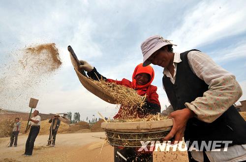 8月19日,甘肅省永登縣上川鎮(zhèn)沙梁墩村農(nóng)民在麥場上勞作。甘肅省通過大力增加農(nóng)業(yè)投入、推廣農(nóng)業(yè)新技術(shù)等手段,努力穩(wěn)定和增加糧食生產(chǎn),今年上半年全省夏糧再獲豐收,預(yù)計(jì)夏糧總產(chǎn)量346萬噸,比去年同期增加9.23%