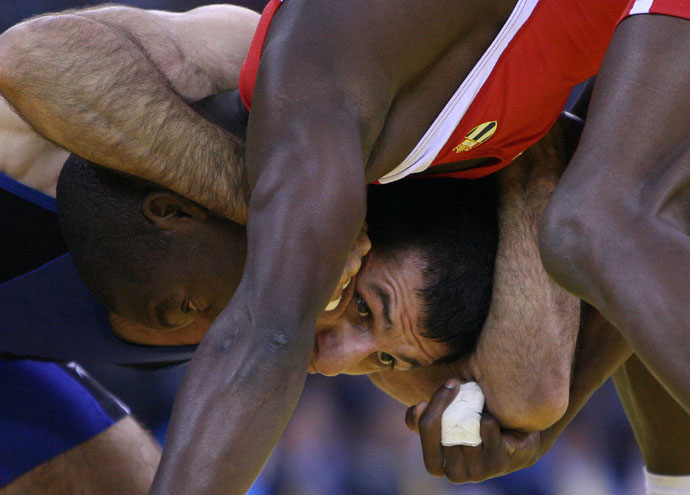 8月20日,在北京奧運(yùn)會(huì)摔跤男子自由式66公斤級(jí)銅牌決賽中,格魯吉亞選手奧塔爾·圖希什維利(左)戰(zhàn)勝古巴選手吉蘇安德里·加爾松,獲得銅牌。