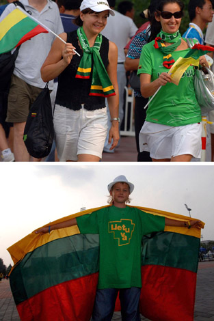 8月20日,立陶宛球迷揮舞國(guó)旗為自己的球隊(duì)助威(拼版照片)。當(dāng)日,中國(guó)男子籃球隊(duì)在北京奧運(yùn)會(huì)男子籃球四分之一決賽中迎戰(zhàn)立陶宛隊(duì)。這場(chǎng)比賽吸引了大批中國(guó)和立陶宛的球迷觀看,為球員加油助威。