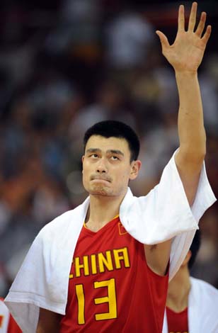 8月20日,中國隊(duì)隊(duì)員姚明在向觀眾致意。