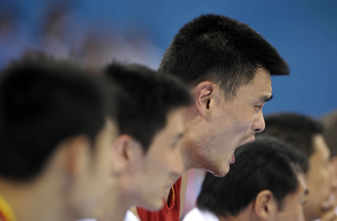 8月20日,在北京五棵松奧林匹克籃球館進(jìn)行的北京奧運(yùn)會男籃1/4決賽中,中國隊以68比94不敵立陶宛隊。這是中國男籃隊員姚明在場邊吶喊。