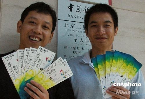 8月15日,2008年北京殘奧會(huì)體育比賽門(mén)票在北京地區(qū)的30個(gè)中國(guó)銀行門(mén)票代售網(wǎng)點(diǎn)銷(xiāo)售,并提供現(xiàn)場(chǎng)打印門(mén)票服務(wù)。公眾持有效身份證件在代售網(wǎng)點(diǎn)排隊(duì)實(shí)時(shí)購(gòu)票,每人每次最多買(mǎi)2個(gè)場(chǎng)次共10張門(mén)票。目前共有205個(gè)比賽場(chǎng)次80萬(wàn)張比賽門(mén)票供銷(xiāo)售,購(gòu)票時(shí)間截至到9月17日。圖為來(lái)自廣東的民眾高興地買(mǎi)到殘奧會(huì)門(mén)票。