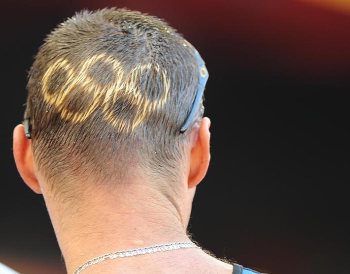 8月22日,北京奧運會男子50公里競走比賽在國家體育場“鳥巢”結束。圖為斯洛伐克選手卡濟米爾·韋爾金頭上的“五環(huán)”。