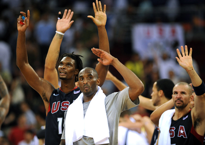 8月22日,美國隊球員科比(中)與隊友在比賽后向觀眾致意。當日,在北京奧運會男籃半決賽中,美國隊以101比81戰(zhàn)勝阿根廷隊,挺進決賽。
