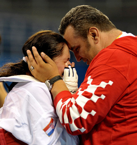 8月22日,克羅地亞選手薩里奇在北京奧運會跆拳道女子67公斤級銅牌爭奪戰(zhàn)中獲勝后,與教練一起慶祝。