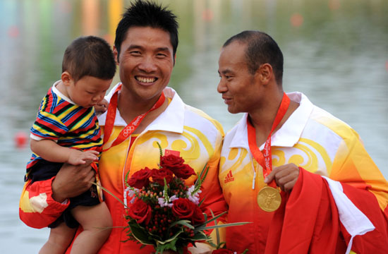 8月23日,孟關(guān)良和楊文軍在北京順義奧林匹克水上公園再次掛上了奧運金牌。 當(dāng)白色的船艇剛觸碰到終點線,孟關(guān)良和楊文軍就摔落到了水里!皩嵲谑翘哿,身體已經(jīng)到極限。剛沖過終點,我就再也無法堅持跪在艇上了!痹诨旌蠀^(qū),孟關(guān)良對于自己落水這樣對新華社記者說。 賽后,兩人的加拿大教練馬克告訴記者,2周前孟關(guān)良的背部就出現(xiàn)了問題。賽前沒有人知道孟關(guān)良還能否出現(xiàn)在奧運賽場上。不過,“他們堅持下來了,是用心在比,表現(xiàn)非常好!敝,馬克激動地說。 男子雙人劃艇500米的頒獎儀式是當(dāng)天倒數(shù)第二個舉行。當(dāng)孟關(guān)良和楊文軍掛著閃閃的金牌面朝五星紅旗時,順義奧利匹克水上公園上空響起了熟悉的《義勇軍進行曲》。當(dāng)觀眾們在為兩人歡呼雀躍時,也許只有孟關(guān)良和楊文軍自己才明白這枚金牌多么來之不易。 “我和他們壓力都很大。4年前奪冠可以說沒什么壓力,但今天不一樣!笨吹絻扇说谝粋沖過終點后,馬克說。 作為上屆雅典奧運會男子雙人劃艇500米衛(wèi)冕冠軍,孟關(guān)良和楊文軍一出現(xiàn)在起航線上,就引起了看臺上無數(shù)中國觀眾的歡呼。當(dāng)天比賽,孟關(guān)良和楊文軍身穿紅黃相間的中國隊服站在了第5道前。2007年世錦賽冠軍的德國組合克里斯蒂安·吉勒/托馬斯·維倫策克,和預(yù)賽中僅落后兩人0.023秒的俄羅斯組合分列第4道和第3道。 一起航,孟關(guān)良和楊文軍很快便顯示了衛(wèi)冕冠軍的實力。50米過后,逐漸擺脫各艇,率先占據(jù)領(lǐng)先位置,德國隊列第三。然而,兩人的衛(wèi)冕之路并非毫無懸念。250米過后,位于第3道的俄羅斯組合謝爾蓋·烏列金/亞歷山大·科斯托格洛德開始加快速度,從第四位一下躍居第二,并且直逼中國隊。不過,孟關(guān)良和楊文軍在最后50米的奮力沖刺挺住了俄羅斯隊的沖擊,第一個沖過終點,成績是1分41秒025。俄羅斯組合獲得銀牌,德國隊名列第三。 紅地毯上的最高領(lǐng)獎臺上,當(dāng)孟關(guān)良和楊文軍在鎂光燈前露出勝利笑臉時,突然出現(xiàn)的一位小客人引起了在場所有人的歡呼。孟關(guān)良15個月大的兒子被抱上了領(lǐng)獎臺。當(dāng)站在臺上的孟關(guān)良從妻子手中接過兒子后,臉上燦爛的喜悅不僅僅來自于胸前掛著的金牌。而一家三口和自己親密“戰(zhàn)友”面對國旗的合影,成為北京奧運會皮劃艇收官之日的一幕經(jīng)典。