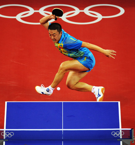 8月23日,中國選手馬琳在比賽中。當(dāng)日,在北京奧運(yùn)會乒乓球男子單打決賽中,馬琳以4比1戰(zhàn)勝隊(duì)友王皓,獲得冠軍。
